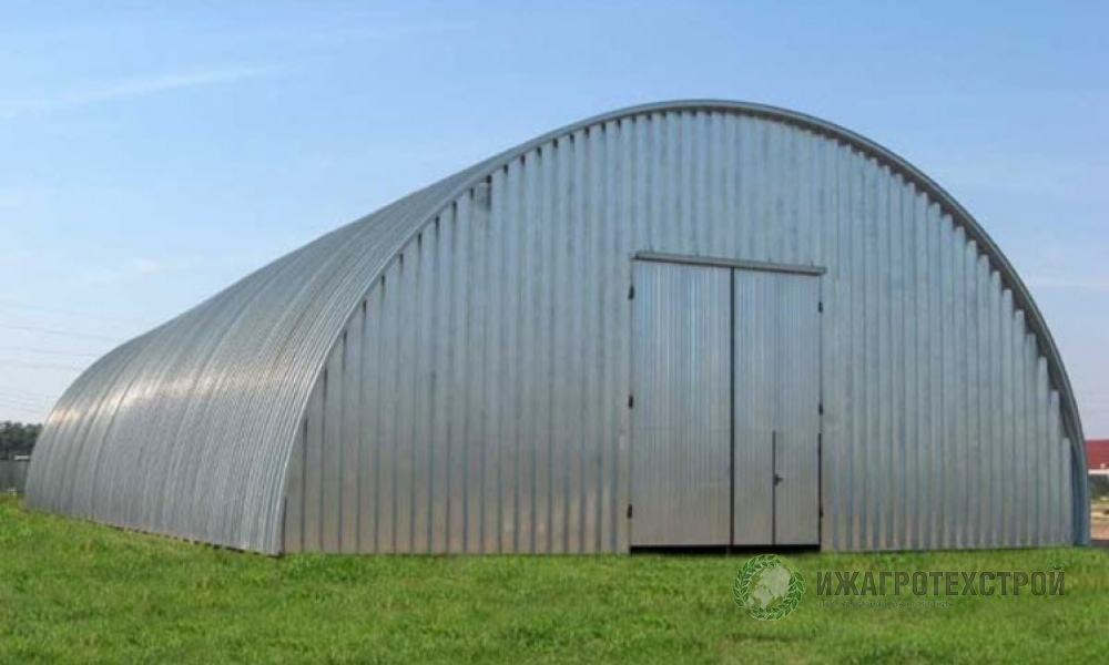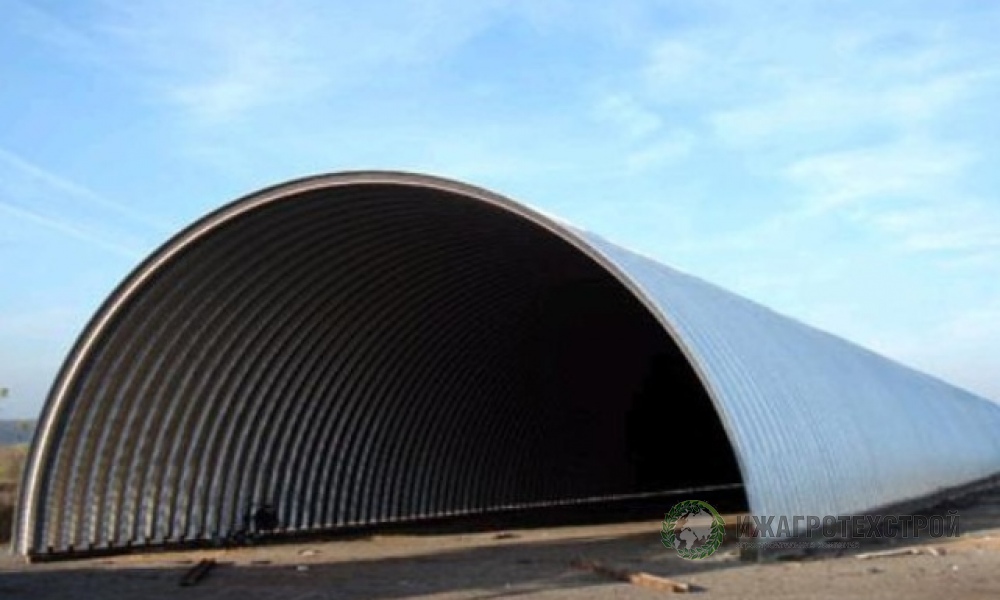 Мы изготавливаем и ведем монтаж сооружения непосредственно на строительной площадке. Для строительства используем оцинкованную, рулонную сталь толщиной 1,2 мм. Такие сооружения не содержат каркаса, балок,